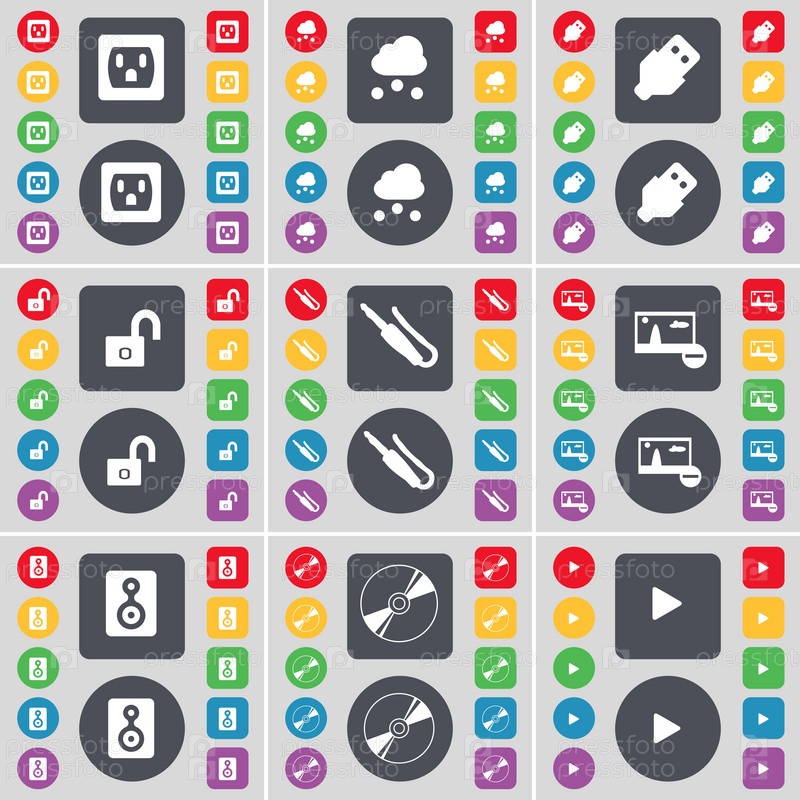 Выключатель, облако, USB, замок, разъем микрофона, картинка, динамик, диск, средства массовой информации играют значок символа. большой набор плоских цветных кнопок для вашего дизайна. вектор