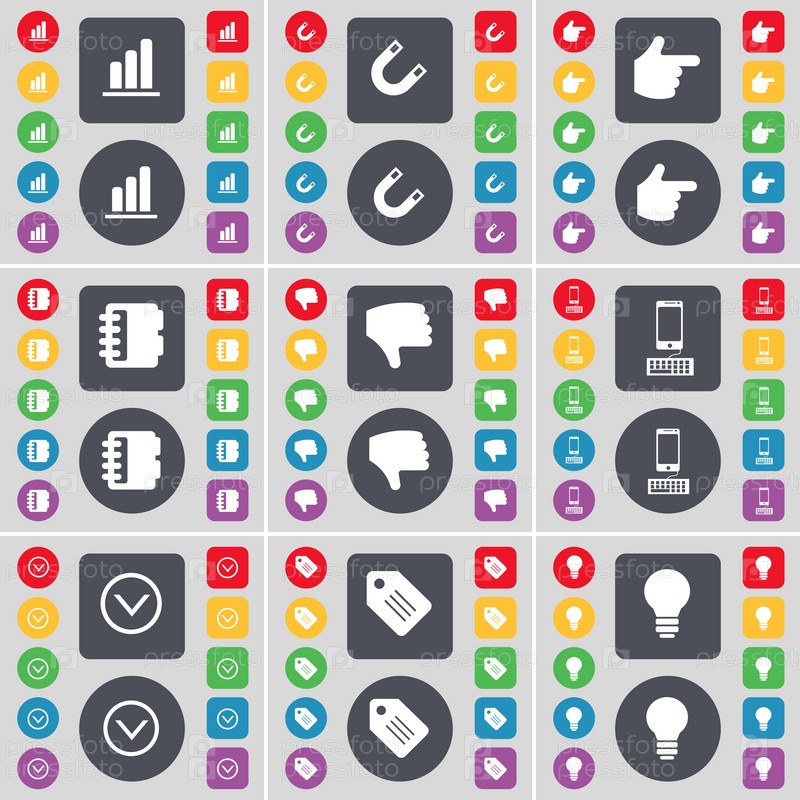 Диаграмма, магнит, рука, ноутбук, неприязнь, смартфон, стрелка вниз, тег, значок символ лампочки. Большой набор плоских, цветные кнопки для вашего дизайна. Вектор