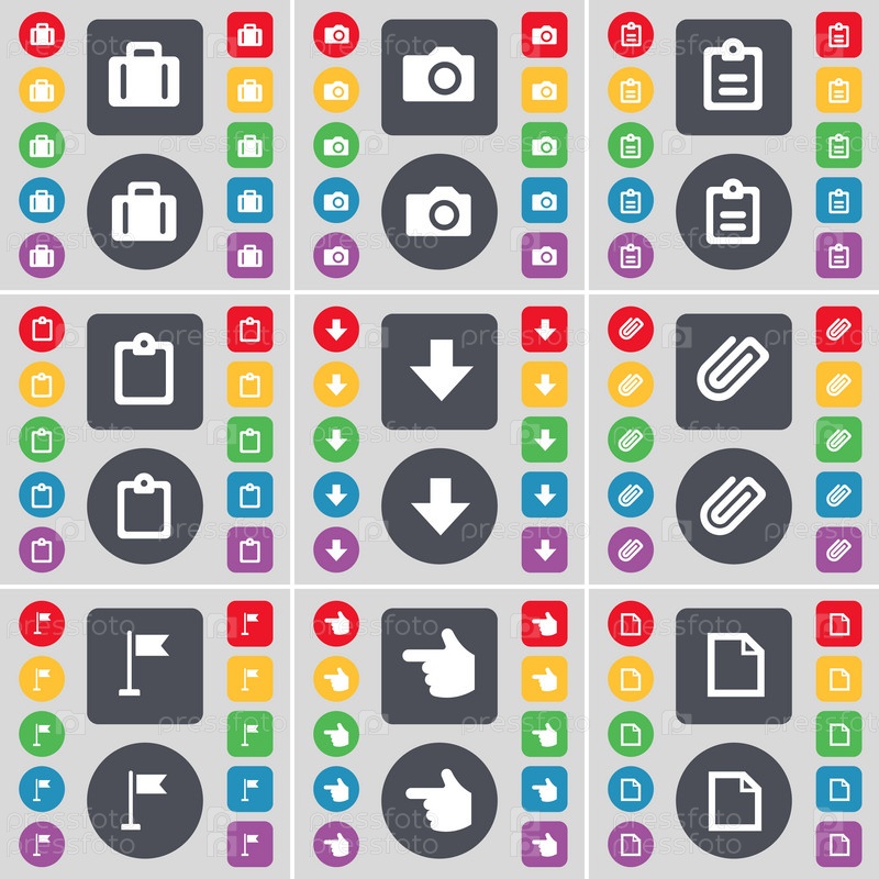 Чемодан, Камера, обследования, стрелка вниз, клип, гольф отверстие, рука, файл значка символ. Большой набор плоских, цветные кнопки для вашего дизайна. Вектор