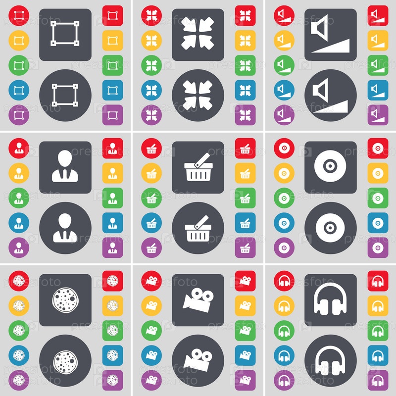 Рама, развертывание экран, объем, аватар, корзина, диск, пицца, пленочной камеры, символ значок наушников. Большой набор плоских, цветные кнопки для вашего дизайна. Вектор