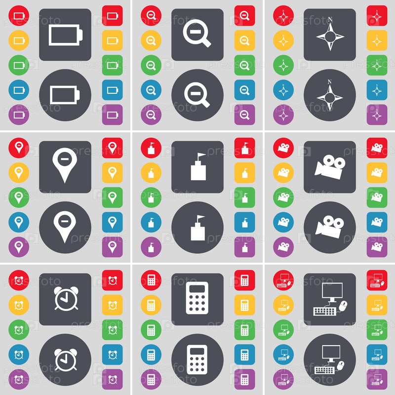 Батарея, минус, компас, контрольно-пропускной пункт, флаг башня, пленочной камеры, Будильник, калькулятор, будильник ПК значок символа. Большой набор плоских, цветные кнопки для вашего дизайна. Вектор