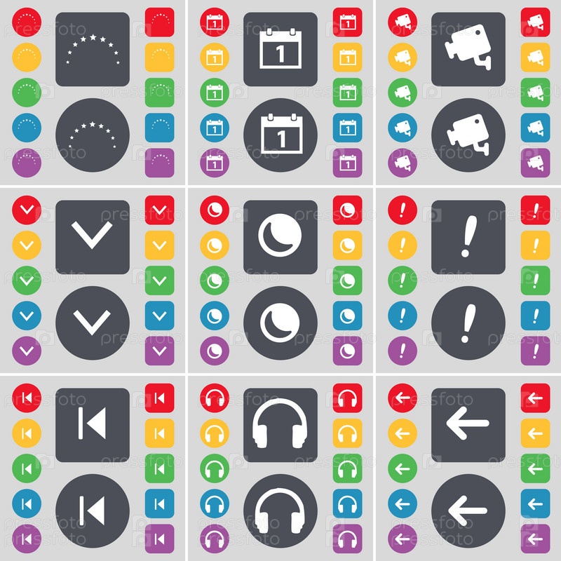 Звезды, календарь, CCTV, стрелка вниз, Луна, восклицательный знак, СМИ скип, наушники, символ слева от значка стрелки. Большой набор плоских цветных кнопок для вашего дизайна. вектор