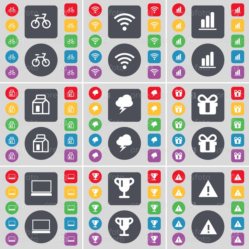 Велосипед, Wi-Fi, диаграмма, упаковка, молнии, подарок, ноутбук, кубок, предупреждение значок символа. большой набор плоских цветных кнопок для вашего дизайна. вектор