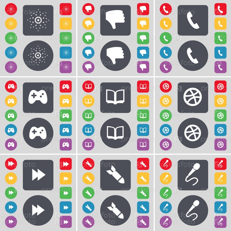 Звезда, неприязнь, приемник, геймпад, книга, мяч, Rewind, ракета, символ иконки микрофона Большой набор плоских цветных кнопок для вашего дизайна. вектор