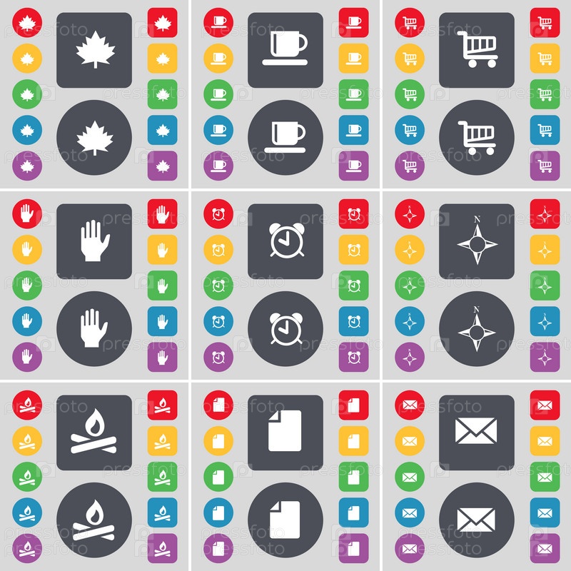Кленовый лист, Кубок, корзина, рука, Будильник, компас, костра, файлов, сообщения значок символа. Большой набор плоских, цветные кнопки для вашего дизайна. Вектор