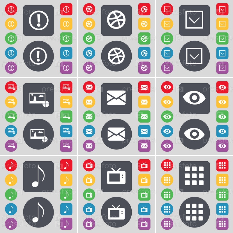 Информация, мяч, стрелка вниз, картинка, сообщение, видение, Примечание, Ретро ТВ, символ значок приложения. Большой набор плоских, цветные кнопки для вашего дизайна. Вектор