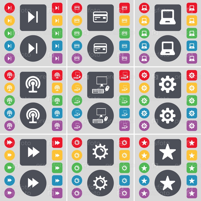Пропустить СМИ, кредитные карты, ноутбук, Wi-Fi, ПК, Gear, Rewind, звездный значок символа.Большой набор плоских цветных кнопок для вашего дизайна.Вектор
