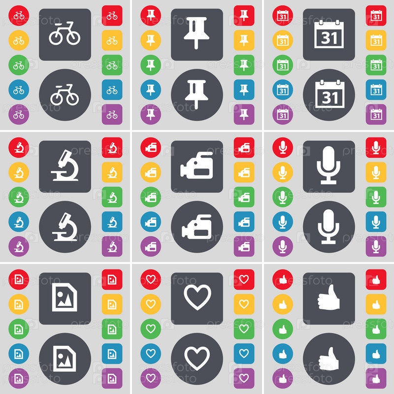 Велосипед, пин, календарь, микроскоп, кинокамера, микрофон, медиафайлы, сердце как значок символа. большой набор плоских цветных кнопок для вашего дизайна. вектор