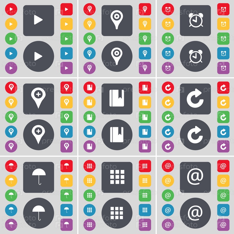 Средства массовой информации играют, контрольно-пропускной пункт, будильник, контрольно-пропускный пункт, словарь, перезагрузка, зонтик, приложения, почтовый значок символа. большой набор плоских цветных кнопок для вашего дизайна. вектор