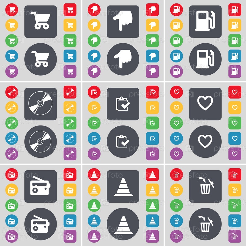 Покупки тележки, ручной, автозаправочная станция, диск, обследования, сердце, Радио, конус, мусор можно значок символа. Большой набор плоских, цветные кнопки для вашего дизайна. Вектор