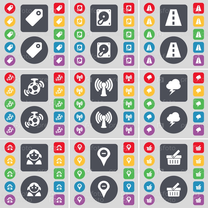 Тег, жесткий диск, дорога, динамик, Wi-Fi, молнии, аватар, контрольно-пропускной пункт, символ икон корзины. Большой набор плоских цветных кнопок для вашего дизайна. вектор