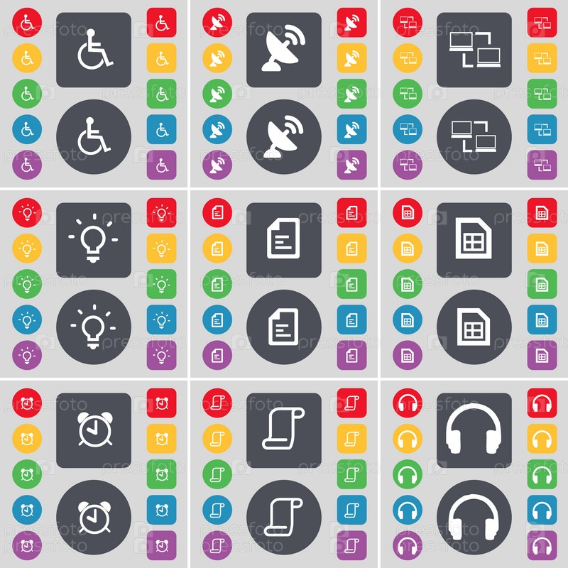 Инвалид, Спутниковая тарелка, связи, свет лампы, текстовый файл, сигнализация, прокрутки, наушники значок символ. Большой набор плоских, цветные кнопки для вашего дизайна. Вектор