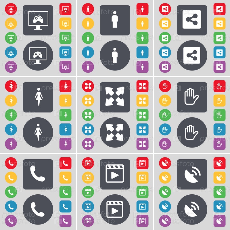 Монитор, силуэт, доля, полный экран, рука, приемник, СМИ p значок символа. Большой набор плоских цветных кнопок для вашего дизайна