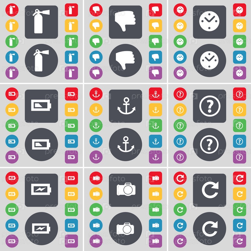 Огнетушитель, неприязнь, часы, батареи, якорь, вопрос Мар значок символа. Большой набор плоских, цветные кнопки для вашего дизайна. Вектор