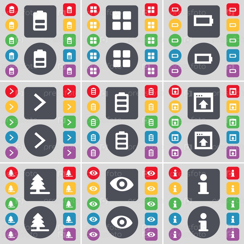 Аккумулятор, приложения, батарея, стрелка справа, окна, елка, видение, информация значок символа. большой набор плоских цветных кнопок для вашего дизайна. вектор