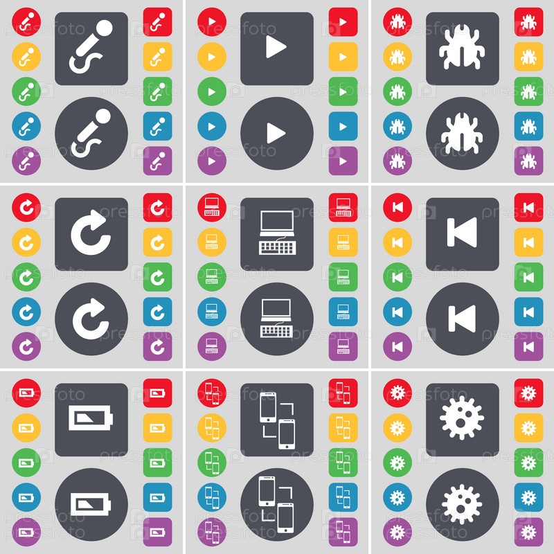Микрофон, средства массовой информации играть, ошибка, ноутбук, перезагрузка, СМИ пропустить, батарея, соединения, значок шестеренка. Большой набор плоских, цветные кнопки для вашего дизайна. Вектор