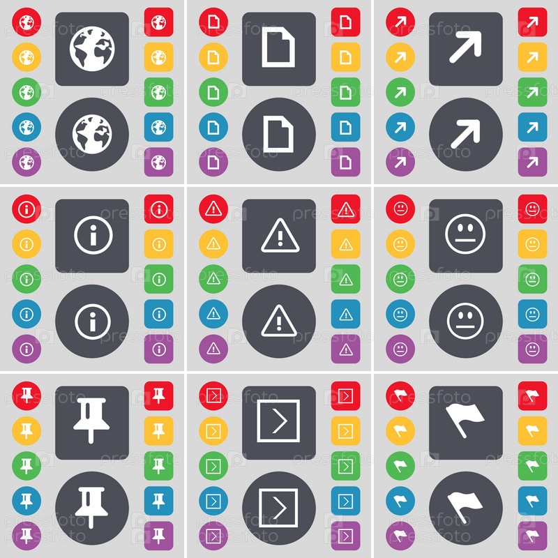 Земля, файл, полный экран, информация, предупреждение, улыбка, пин, символ значка стрелки. большой набор плоских цветных кнопок для вашего дизайна. вектор