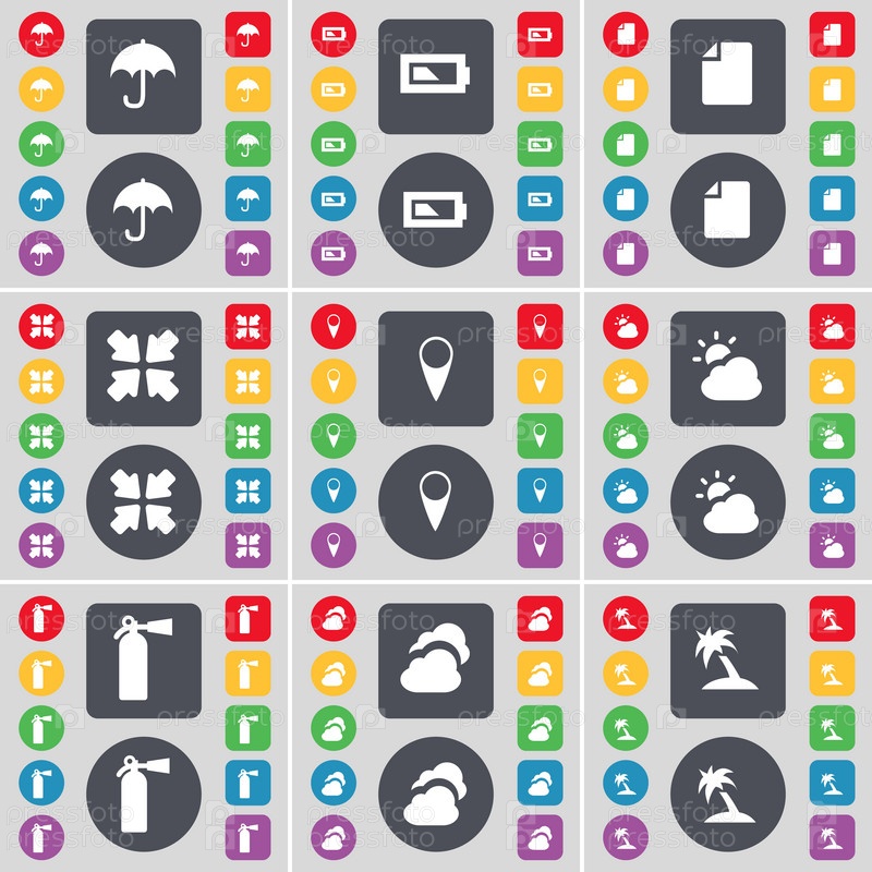 Зонтики, батарея, файл, развертывание экрана, контрольно-пропускная точка, облако, значок символа Fi. Большой набор плоских цветных кнопок для вашего дизайна. вектор