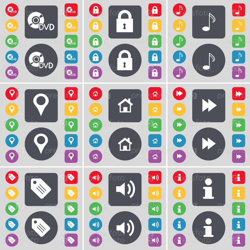 DVD, замок, примечание, контрольно-пропускной пункт, дом, Rewind, тег, звук, информационный значок символа. большой набор плоских цветных кнопок для вашего дизайна. вектор