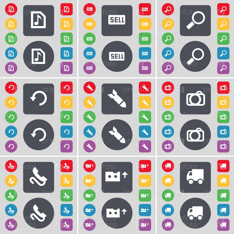 Музыкальный файл, продажа, увеличительное стекло, перезагрузка, ракета, камеры, приемник, кассета, грузовик значок символа. Большой набор плоских, цветные кнопки для вашего дизайна. Вектор