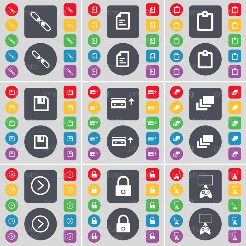 Ссылка, текстовый файл, обследования, дискету, кассету, галерея, стрелка вправо, замок, игровой консоли значок символа. Большой набор плоских, цветные кнопки для вашего дизайна. Вектор