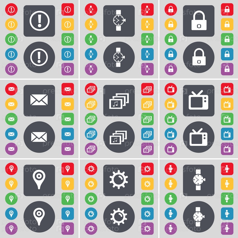 Информация, наручные часы, замок, сообщение, галерея, Ретро ТВ, контрольно-пропускной пункт, значок шестеренка. Большой набор плоских, цветные кнопки для вашего дизайна. Вектор