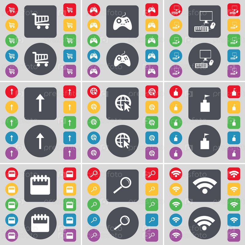 Корзина, геймпад, ПК, стрелка вверх, веб-курсор, флаг башни, значок символа Ca. Большой набор плоских цветных кнопок для вашего дизайна. вектор