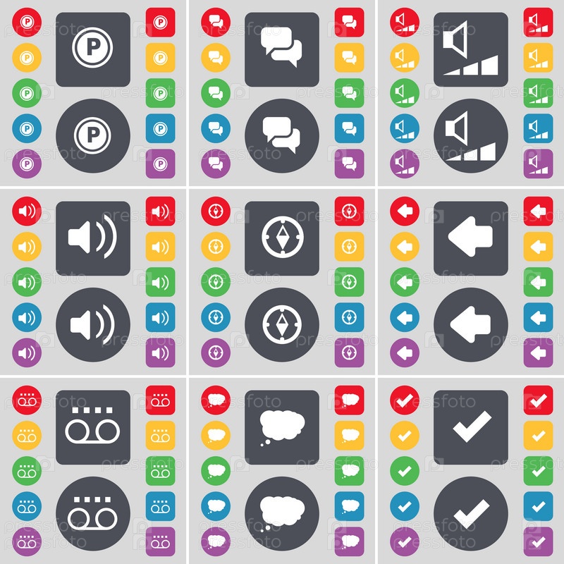 Парковка, чат, объем, звук, компас, стрелка слева, кассеты, Cha значок символа. большой набор плоских цветных кнопок для вашего дизайна. вектор