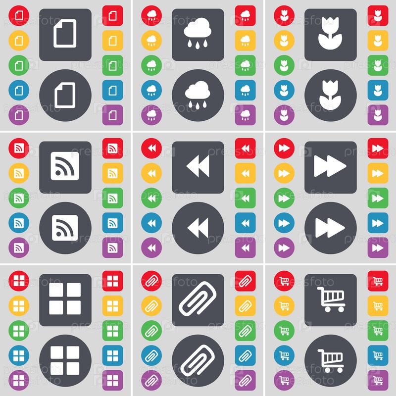 Файл, облако, цветок, RSS, Rewind, Apps, клип, иконка символа корзины покупок. большой набор плоских цветных кнопок для вашего дизайна. вектор
