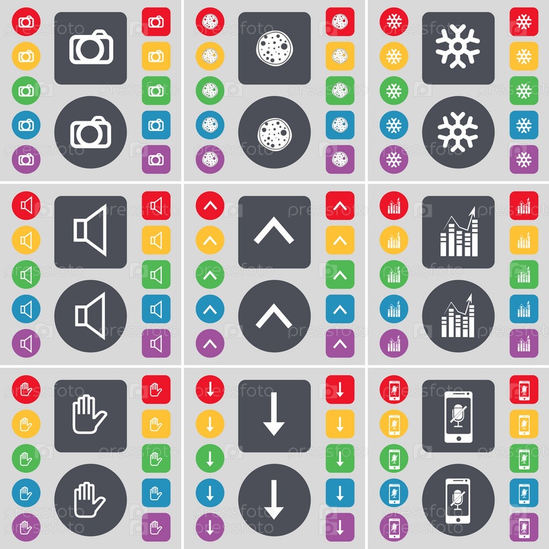 Камеры, пицца, снежинка, звук, стрелка вверх, граф, рука, стрелка вниз, смартфон значок символа. Большой набор плоских, цветные кнопки для вашего дизайна. Вектор