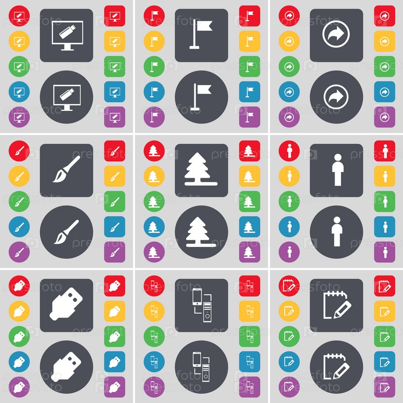 Монитор, отверстие для гольфа, спина, кисть, ёлка, силуэт, USB, значок символа Конн. большой набор плоских цветных кнопок для вашего дизайна. вектор