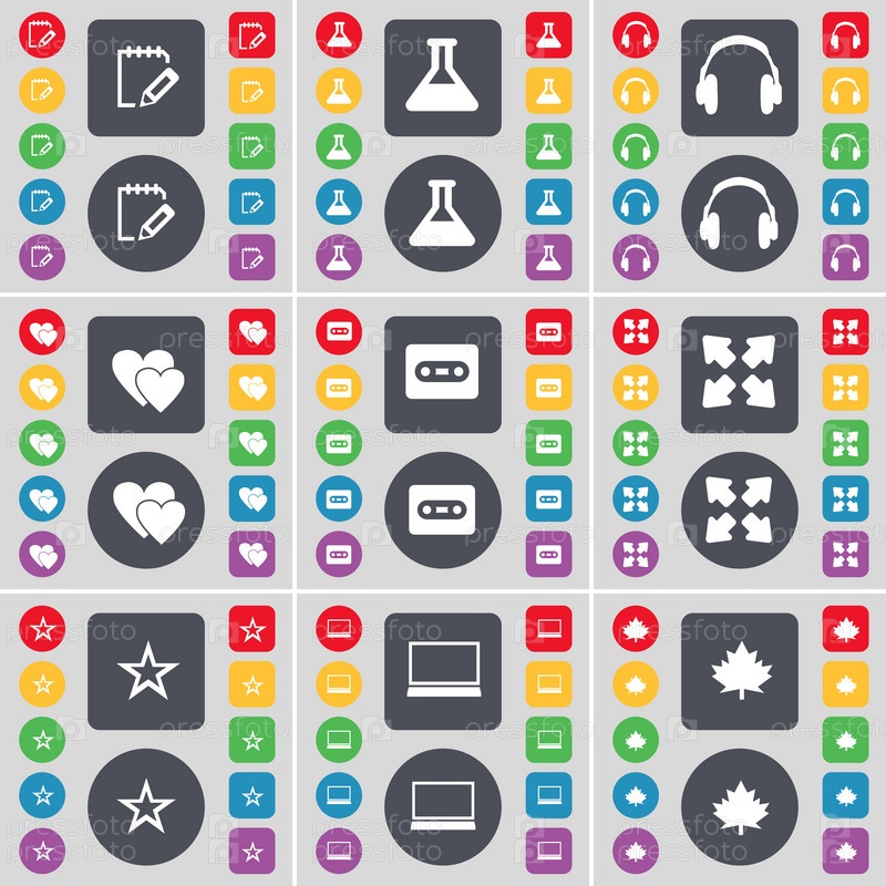 Ноутбук, настой, наушники, сердце, кассеты, полный экран, ноутбук, кленовый лист значок символа, звезда. Большой набор плоских, цветные кнопки для вашего дизайна. Вектор