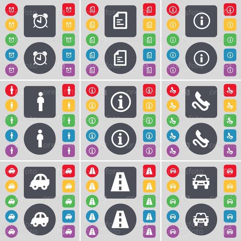 Будильник, текстовый файл, информация, силуэт, приемник, автомобиль, дорога значок символа. Большой набор плоских, цветные кнопки для вашего дизайна. Вектор