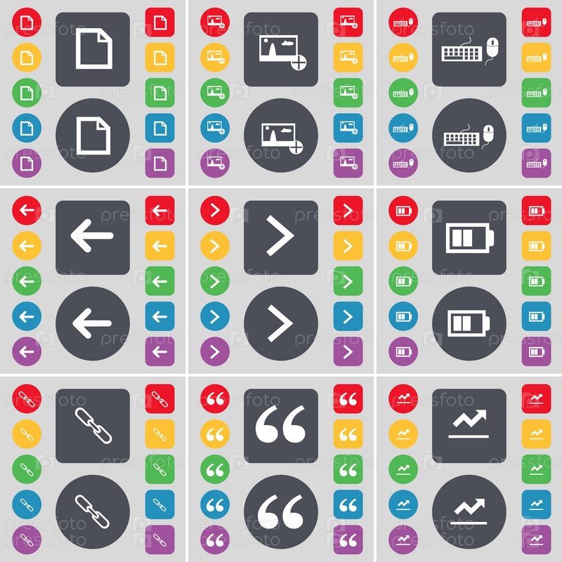 Файл, изображение, клавиатура, стрелка влево, стрелка вправо, батареи, ссылка, кавычки, граф значок символа. Большой набор плоских, цветные кнопки для вашего дизайна. Вектор
