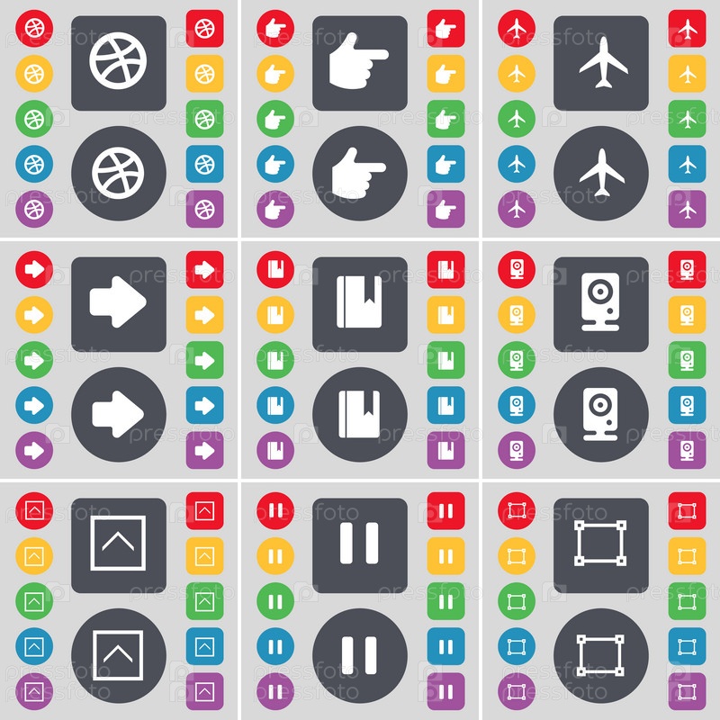 Шарик руки, самолет, стрелку справа, словарь, спикер, стрелка вверх, пауза, символ значок кадра. Большой набор плоских, цветные кнопки для вашего дизайна. Вектор