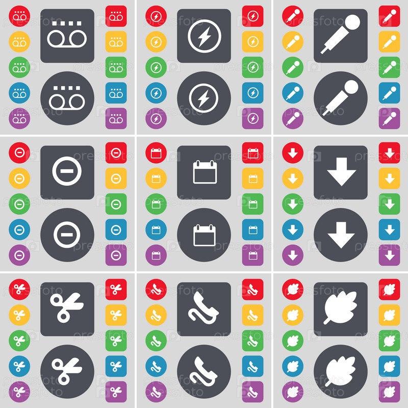 Кассета, Флэш, микрофон, минус, календарь, стрелка вниз, ножницы, приемник, лист значка символа. большой набор плоских цветных кнопок для вашего дизайна. вектор