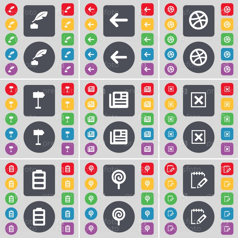 Чернила горшок, стрелка влево, мяч, Sighpost, газета, стоп, батарея, конфета, блокнот значок символа. большой набор плоских цветных кнопок для вашего дизайна. вектор