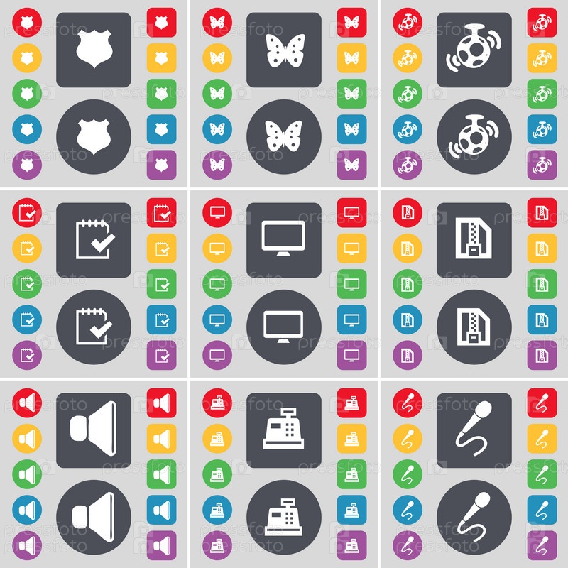 Полицейский значок, бабочка, динамик, обследование, монитор, ZIP-файл, звук, кассовый аппарат, символ икон микрофона. большой набор плоских цветных кнопок для вашего дизайна. вектор