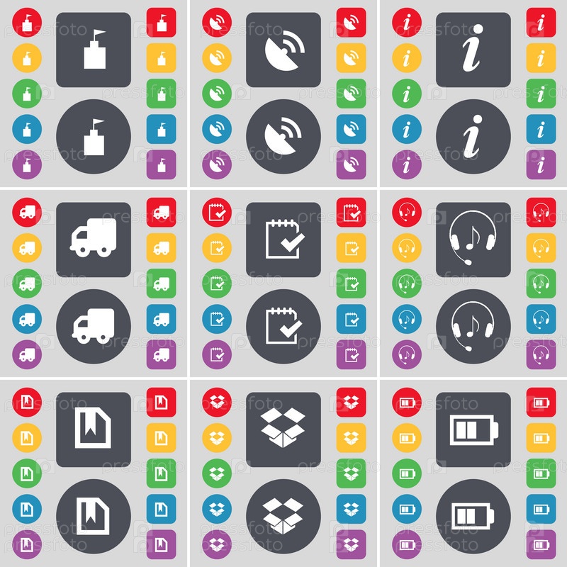 Флаг башня, Спутниковая тарелка, информация, грузовик, тик, символ значок наушников. Большой набор плоских, цветные кнопки для вашего дизайна. Вектор