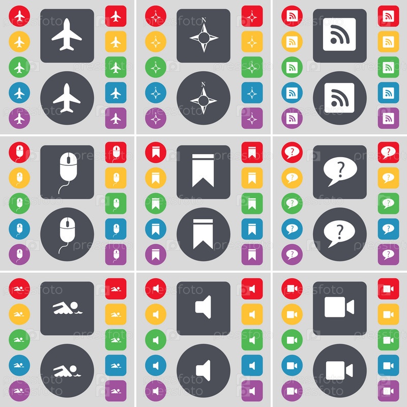 Самолет, компас, RSS, мышь, маркер, пузырь чата, плаватель, звук, кинокамера иконки символа. большой набор плоских цветных кнопок для вашего дизайна. вектор