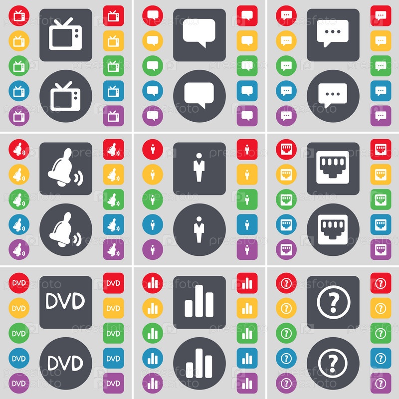 Ретро-ТВ, пузырь для чата, Белл, силуэт, LAN-сокет, DVD, диаграмма, значок символа вопросительного знака. Большой набор плоских цветных кнопок для вашего дизайна. вектор