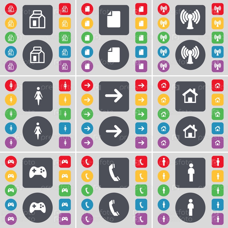 Упаковка, файл, Wi-Fi, силуэт, стрелка направо, дом, геймпад, приемник, силуэт значка символа.Большой набор плоских цветных кнопок для вашего дизайна.Вектор
