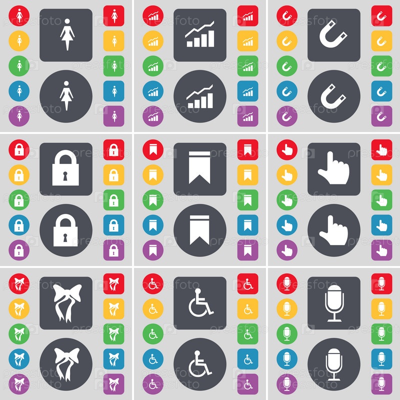 Силуэт, граф, магнит, замок, маркер, рука, лук, инвалид, символ значок микрофона. Большой набор плоских, цветные кнопки для вашего дизайна. Вектор