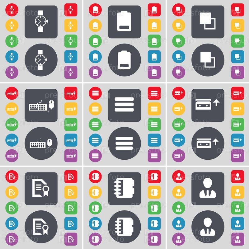 Часы, аккумуляторы, копировальные устройства, клавиатуры, приложения, кассеты, текстовые файлы, блокнот, символ значка аватара. Большой набор плоских цветных кнопок для вашего дизайна. вектор