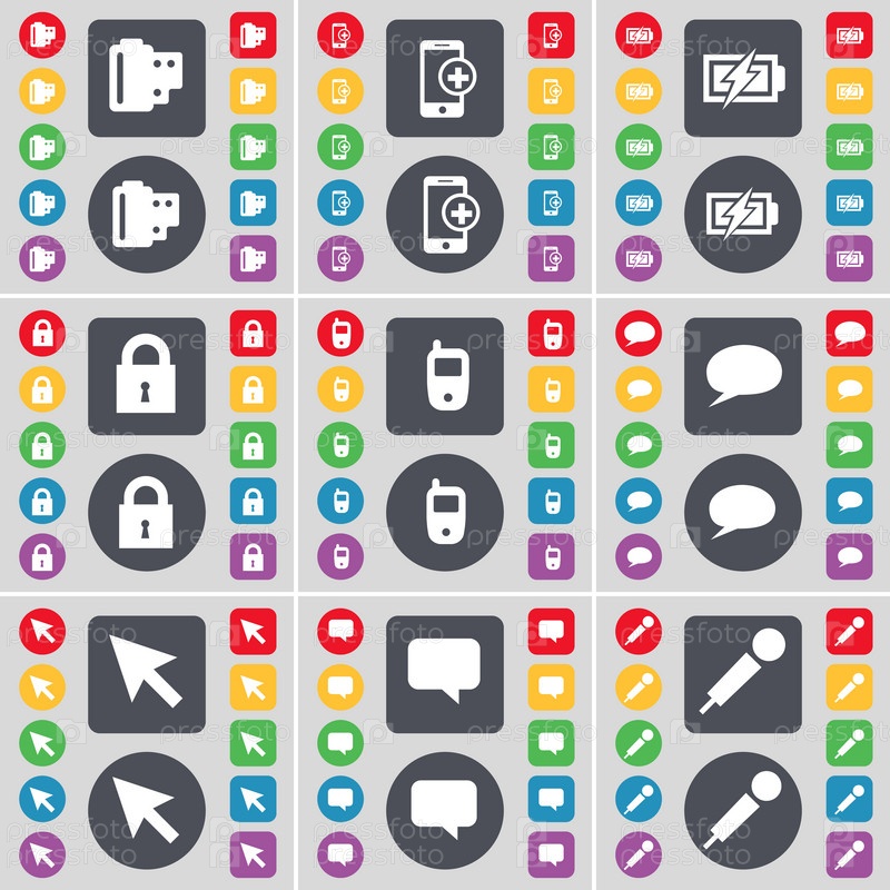 Негативных пленок, смартфоны, зарядки, замок, мобильный телефон, чат чат пузыря, курсор, пузырь, символ значок микрофона. Большой набор плоских, цветные кнопки для вашего дизайна. Вектор