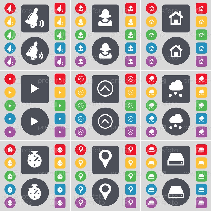 Белл, аватар, дом, средства массовой информации играть, стрелка вверх, облако, остановить часы, контрольно-пропускной пункт, символ значок жесткого диска. Большой набор плоских, цветные кнопки для вашего дизайна. Вектор