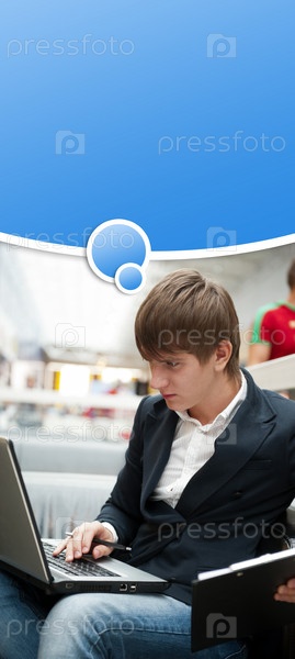 Молодой человек с ноутбуком работает в кафе, над его головой словесный пузырь