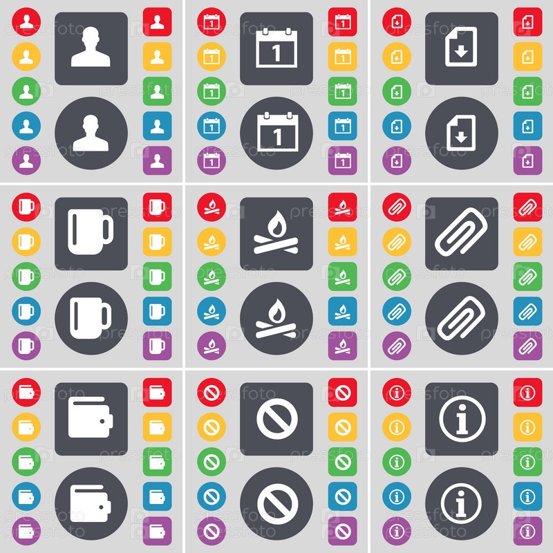 Аватар, календарь, скачать файл, Кубок, костра, клип, бумажник, остановить, информация значок символа. Большой набор плоских, цветные кнопки для вашего дизайна. Вектор