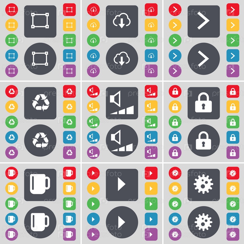 Рама, облако, стрелка вправо, переработка, объем, замок, Кубок, средства массовой информации играть, значок шестеренка. Большой набор плоских, цветные кнопки для вашего дизайна. Вектор