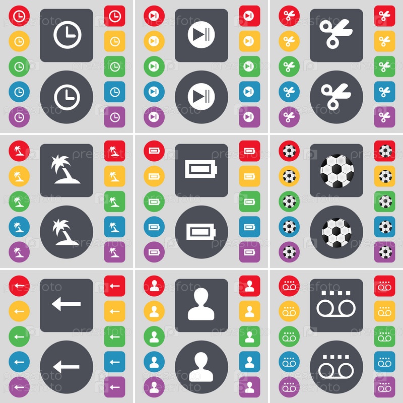 Будильник, средства массовой информации показывать, ножницы, пальмы, батарея, мяч, стрелка влево, аватар, кассета значок символ. Большой набор плоских, цветные кнопки для вашего дизайна. Вектор